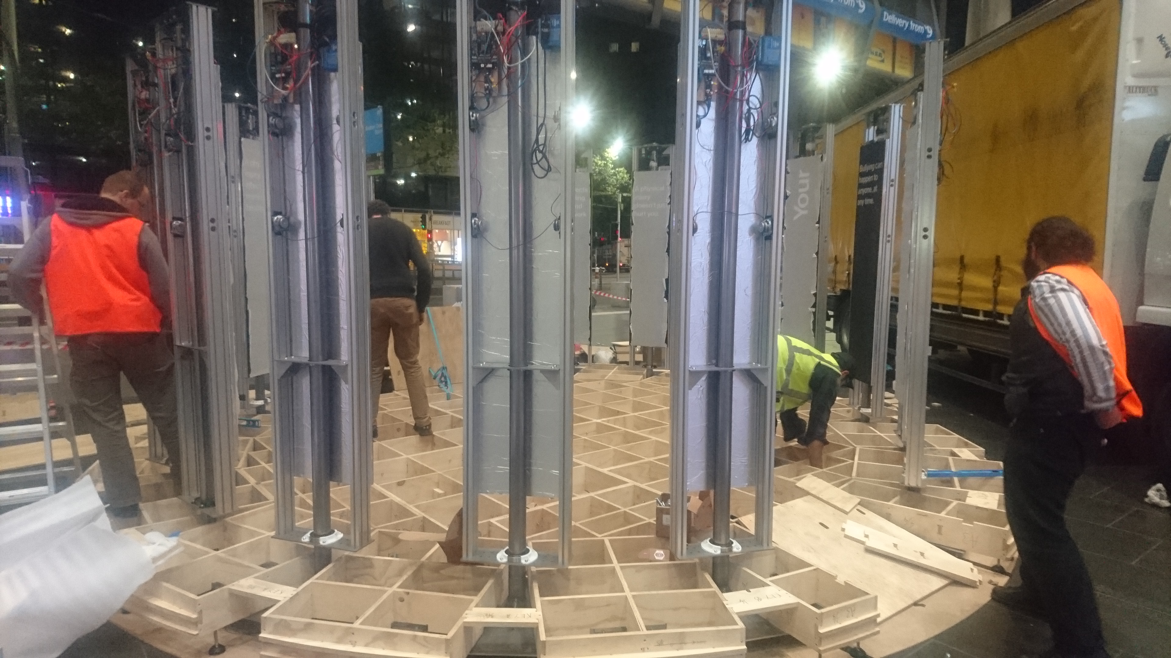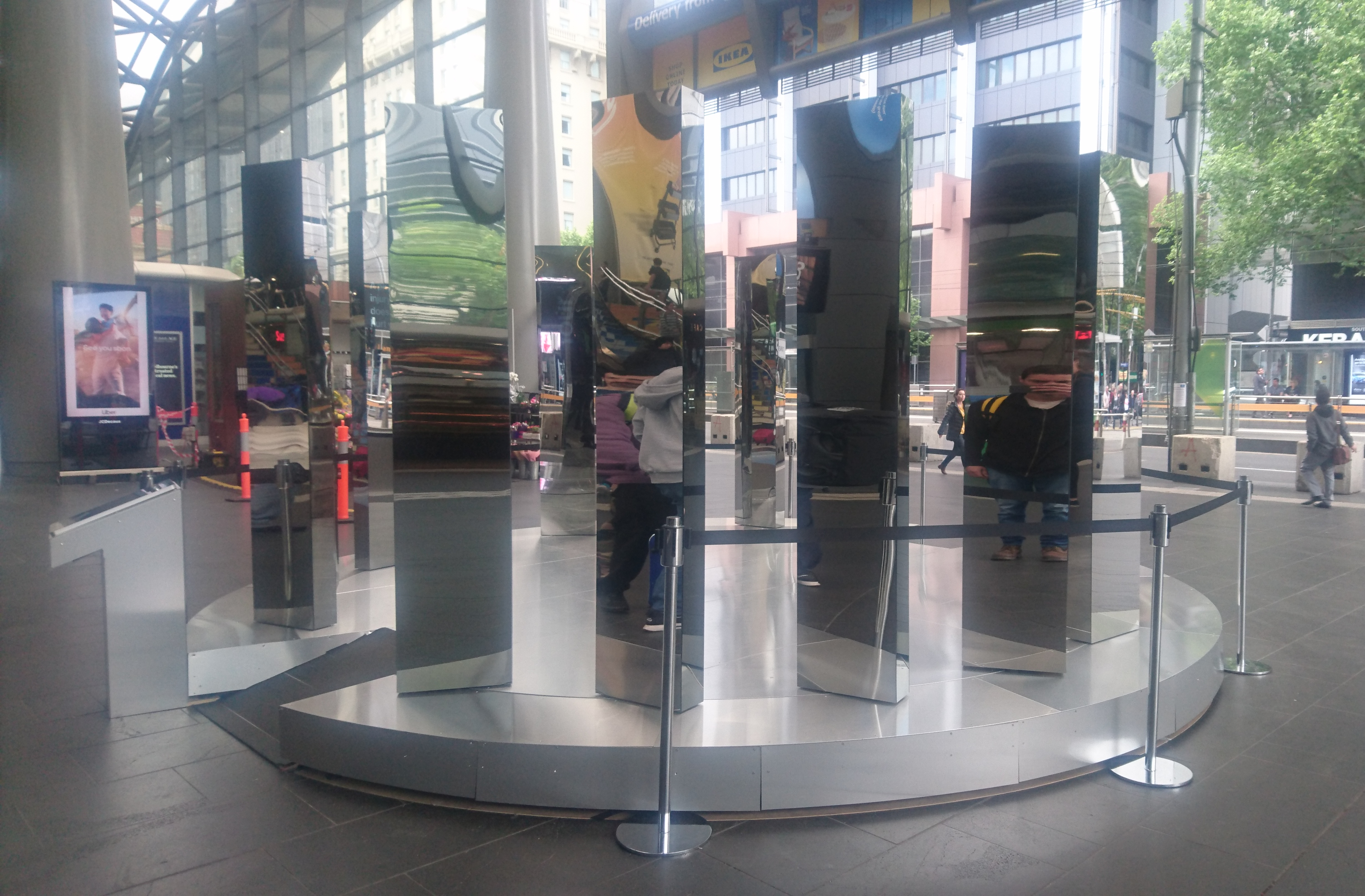 Project: A large, circular, silver stage with ten rotating, two-way mirrored columns emanating light and sound. Interactive kiosks to guide users through the art piece that explores how we are a reflection of our workplace culture.